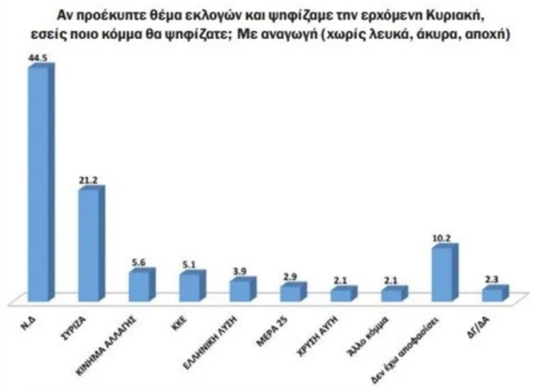 Στην πρόθεση ψήφου με αναγωγή επί των έγκυρων το προβάδισμα της Νέας Δημοκρατίας διευρύνεται στις 23,3 μονάδες. Ειδικότερα, η ΝΔ καταγράφει 44,5%, ο ΣΥΡΙΖΑ 21,2%, το ΚΙΝΑΛ 5,6%, το ΚΚΕ 5,1%, η Ελληνική Λύση 3,9%, το ΜέΡΑ25 2,9%, η Χ.Α. 2,1%. Στο 10,2% οι αναποφάσιστοι.