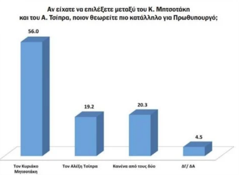 Καταλληλότερος για πρωθυπουργός εμφανίζεται ο Κυριάκος Μητσοτάκης με 56%, ενώ ο Αλέξης Τσίπρας συγκεντρώνει 19,2%.