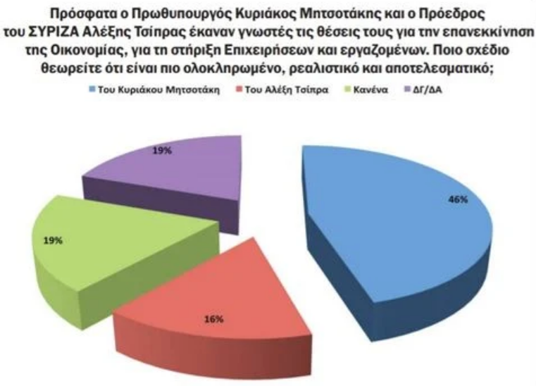 Ακόμα, το 46% εκτιμά πως το πρόγραμμα στήριξης της οικονομίας που ανακοίνωσε η κυβέρνηση είναι πιο ρεαλιστικό και ολοκληρωμένο, ενώ το 16% επιλέγει το πρόγραμμα του ΣΥΡΙΖΑ. Το 19% απαντά κανένα από τα δύο.