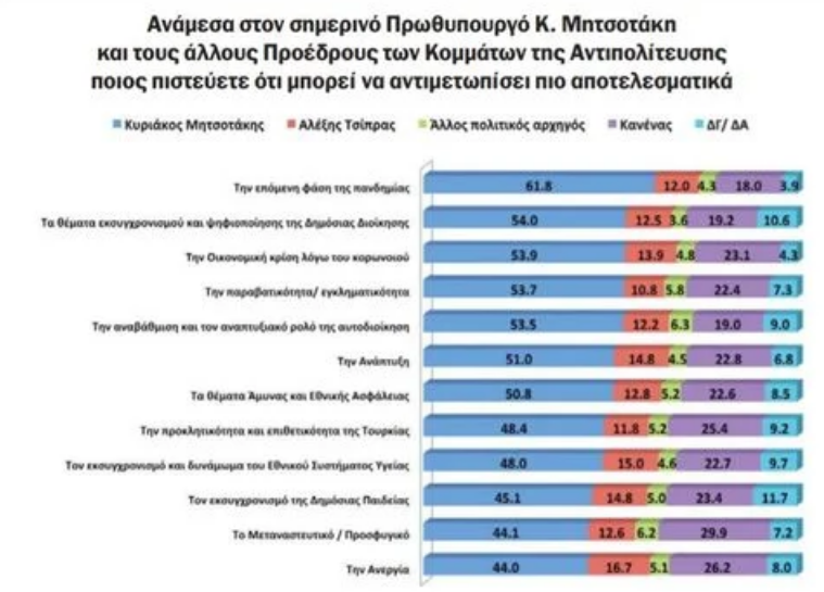 Το 61,8% απαντά πως ο κ. Μητσοτάκης θα διαχειριστεί καλύτερα την επόμενη φάση της πανδημίας σε σχέση με τον Αλ. Τσίπρα που επιλέγει το 12%. Το 54% απαντά πως ο κ. Μητσοτάκης θα διαχειριστεί καλύτερα τα θέματα εκσυγχρονισμού της δημόσιας διοίκησης σε σχέση με τον Αλ. Τσίπρα που επιλέγει το 12,5%. Το 53,9% εκτιμά πως ο κ. Μητσοτάκης θα διαχειριστεί καλύτερα την ύφεση λόγω της πανδημίας, σε σχέση με τον Αλ.Τσίπρα που επιλέγει το 13,9%.