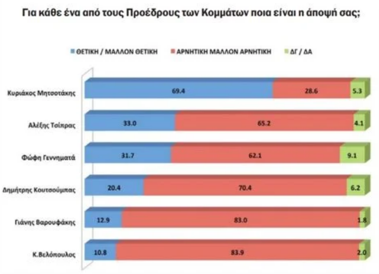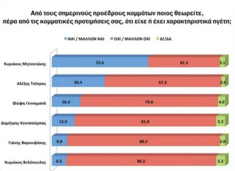 Τέλος, το 55,6% εκτιμά πως ο Κ. Μητσοτάκης έχει χαρακτηριστικά ηγέτη. Αντίστοιχα για τον Αλ. Τσίπρα το ποσοστό αυτό ανέρχεται σε 30,4%, για τη Φ. Γεννηματά σε 16,4%, για τον Δ. Κουτσούμπα σε 13%, για τον Γ. Βαρουφάκη σε 8,8% και για τον Κ. Βελόπουλο σε 8,3%.