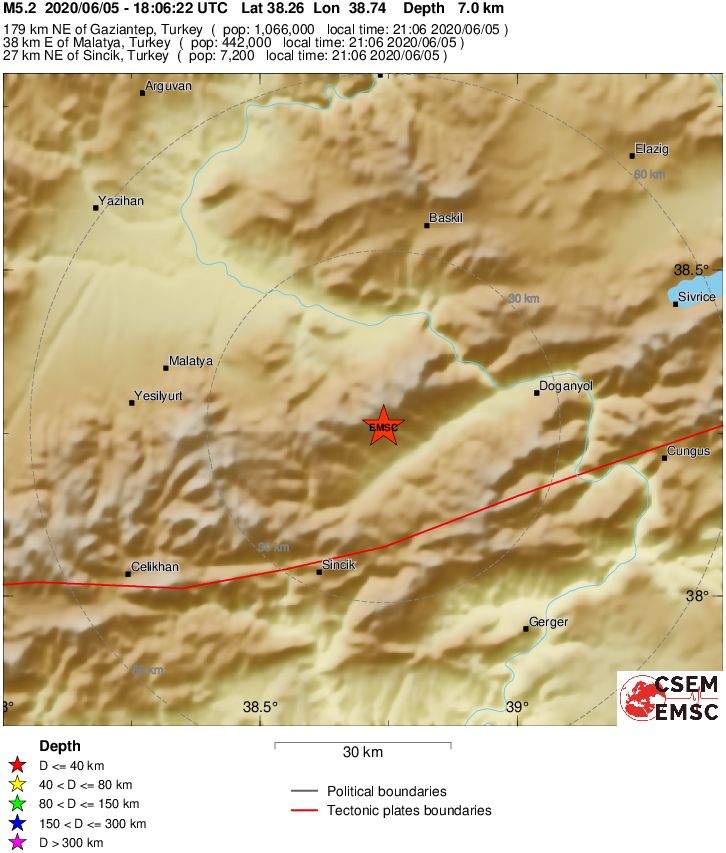 Ισχυρός σεισμός 5.2 Ρίχτερ σημειώθηκε στην Τουρκία, κοντά στην Μαλάτεια, λίγο μετά τις 9 το βράδυ της Παρασκευής.