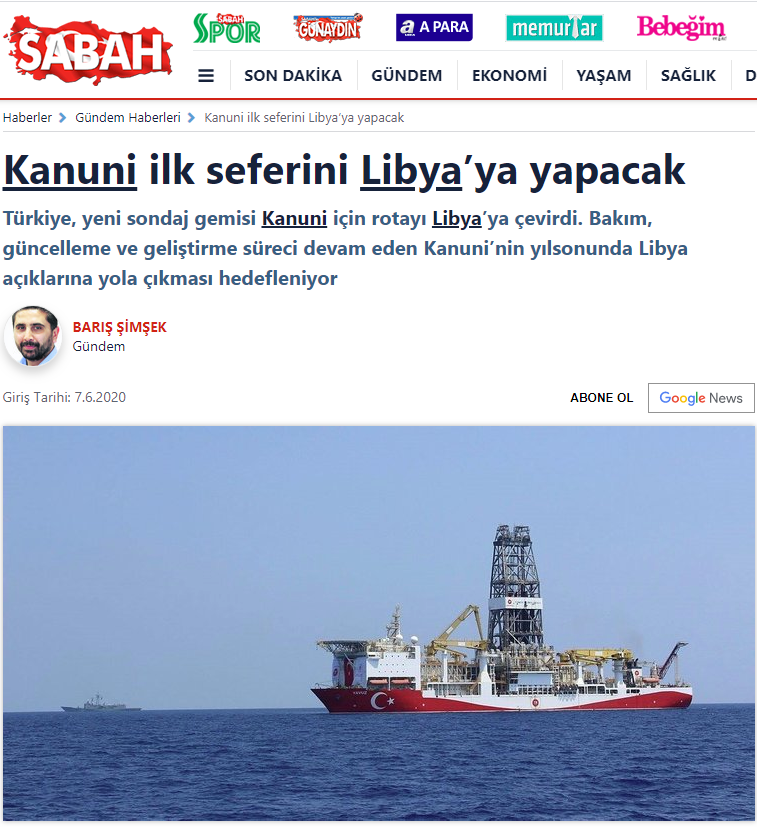 «Μετά την ολοκλήρωση των τρισδιάστατων σεισμικών ερευνών σε μια έκταση 50.000 τετραγωνικών χιλιομέτρων και των δισδιάστατων σε μια έκταση 52.0000 τ. χλμ. στην ανατολική Μεσόγειο από τα ερευνητικά σκάφη Οruc Reis και Barbaros καθώς και το πλωτό γεωτρύπανο Yavuz η Τουρκία θα στείλει το νέο πλωτό γεωτρύπανο «Κανουνί» [στα ελληνικά σημαίνει «Νομοθέτης»] στη Λιβύη», αναφέρει το δημοσίευμα.