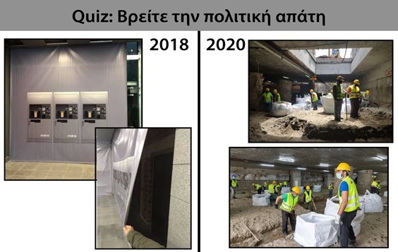 Σε αυτήν αντιπαραβάλλονται, από τη μια μεριά, τα πολυσυζητημένα «εκτυπωμένα» εκδοτήρια που κοσμούσαν τους χώρους του σταθμού κατά την επίσκεψη του τότε Πρωθυπουργού στα τέλη του 2018, ενώ από την άλλη απεικονίζονται οι εν εξελίξει εργασίες στον σταθμό «Βενιζέλου».