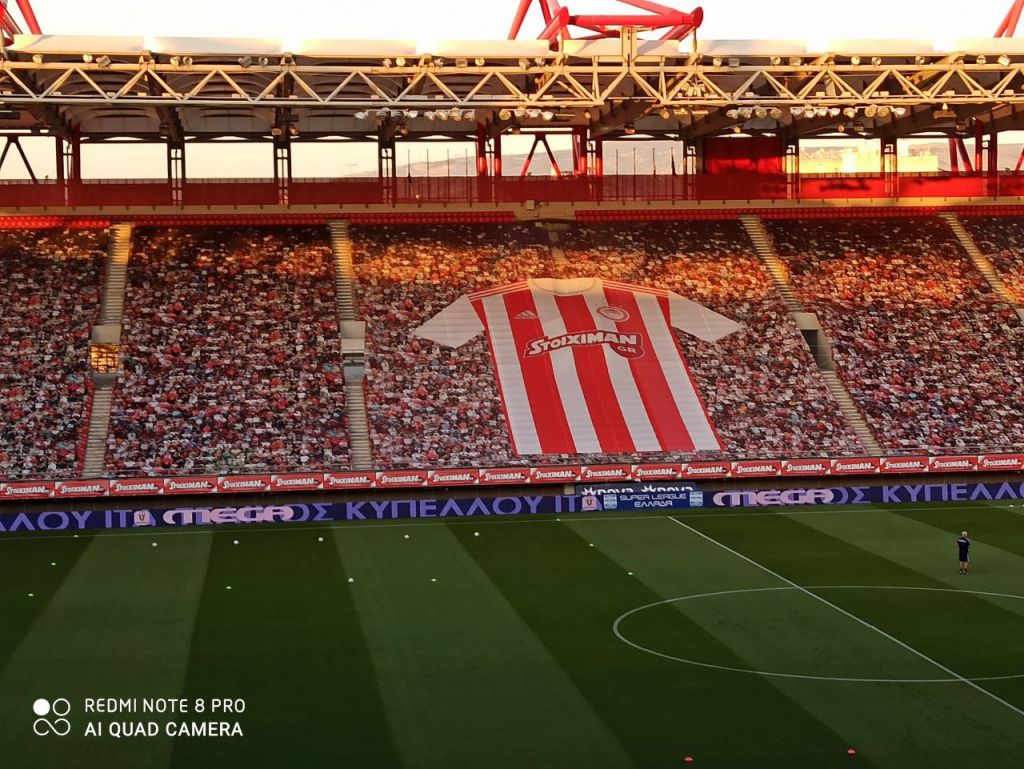 Στην κεντρική κερκίδα που βρίσκεται απέναντι από τα δημοσιογραφικά, έχει τοποθετηθεί μια πολύ μεγάλη φανέλα του Ολυμπιακού, ενώ αριστερά και δεξιά υπάρχουν… οπαδοί.
