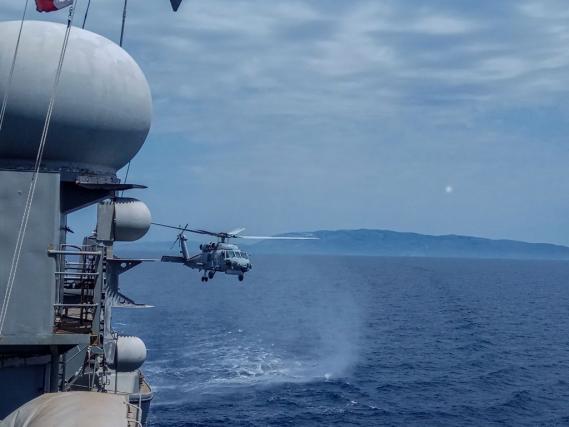 Κατά την διάρκεια της διαδρομής νότια της Κρήτης ασκήθηκαν με εφτά φρεγάτες και μια κορβέτα που πλέουν σε όλη αυτή την περιοχή.