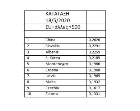 Για τη χώρα μας η συγκριτική βελτίωση είναι πολύ μεγάλη διότι εισήλθε στην πρώτη χρυσή δεκάδα, ενώ είχε ξεκινήσει μέσα Μαρτίου από την 23η θέση. Η διαχείριση της πανδημίας ήταν πολύ καλή με τα περιοριστικά μέτρα του ολικού lockdown και συνεχίστηκε βέλτιστα και με τη σταδιακή άρση αυτών. Μένει να δούμε στη νέα κατάταξη που θα πραγματοποιήσουμε σε 15 μέρες, αρχές Ιουλίου, μετά τον ερχομό των τουριστών.