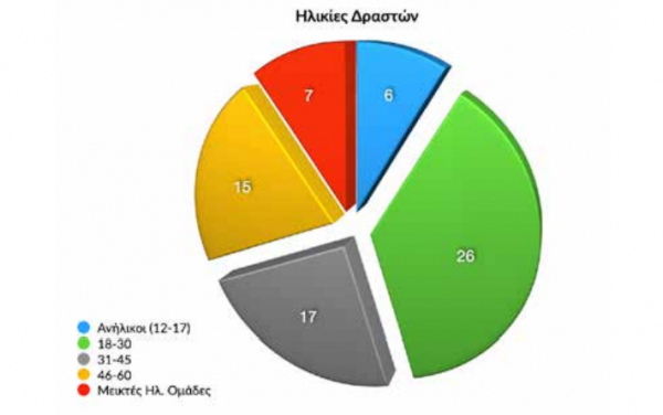 Σε 17 περιστατικά οι δράστες ήταν μεταξύ 31-45 ετών, ενώ καταγράφηκαν και 15 περιστατικά με μεγαλύτερους σε ηλικία δράστες (έως και 80 ετών). Ενώ σε 29 περιστατικά η ηλικία των δραστών δεν ήταν δυνατό να προσδιοριστεί, σε 7 περιστατικά, ιδίως περιστατικά όπου η ρατσιστική βία εκφράζεται ενδοοικογενειακά, η ηλικιακή κλίμακα των δραστών ποικίλει.
