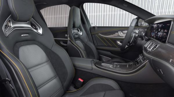Στο εσωτερικό δεσπόζουν το νέο σπορ τιμόνι, ο ατμοσφαιρικός φωτισμός από LED και ένα σετ σπορ καθισμάτων της AMG με κίτρινες ραφές. Η Mercedes έχει επίσης αναβαθμίσει το σύστημα infotainment με περισσότερες λειτουργίες και νέα γραφικά το οποίο και στην προκειμένη περίπτωση φιλοξενείται σε ένα δίδυμο οθονών 12,3 ιντσών όπου εδράζονται ο πίνακας οργάνων και η οθόνη του συστήματος ψυχαγωγίας και ενημέρωσης, αντίστοιχα.