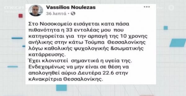 Σήμερα αναμένεται να οδηγηθεί στον ανακριτή για να απολογηθεί η 33χρονη γυναίκα που άρπαξε τη 10χρονη Μαρκέλλα πριν λίγες μέρες στην Θεσσαλονίκη.