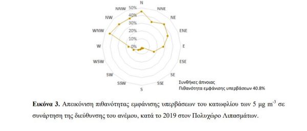 Επιπλέον, θέτοντας ως τιμή κατωφλίου τα 5 μg m3 (χρησιμοποιείται το ετήσιο όριο καθώς δεν υπάρχει αντίστοιχο ημερήσιο ή ωριαίο) και εφαρμόζοντας την στατιστική τεχνική CPF (Conditional Probability Function), αποτυπώνεται στην Εικόνα 3 η πιθανότητα εμφάνισης ημίωρων υπερβάσεων της συγκεκριμένης τιμής ανά τομέα διεύθυνσης του ανέμου. Παρατηρείται αυξημένη πιθανότητα υπέρβασης του κατωφλίου κατά την επικράτηση ανέμων προερχόμενων από τον βόρειο τομέα (δείκτες της κίτρινης γραμμής ανά διεύθυνση) καθώς και κατά τις συνθήκες άπνοιας».