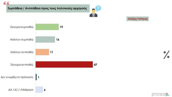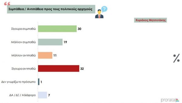 Στην ερώτηση σχετικά με τη συμπάθεια/αντιπάθεια προς τους πολιτικούς αρχηγούς, το 49% δηλώνει ότι σίγουρα/μάλλον συμπαθεί τον Κυριάκο Μητσοτάκη, το 35% τον Αλέξη Τσίπρα, το 25% την Φώφη Γεννηματά, το 25% τον Δημήτρη Κουτσούμπα, το 10% τον Κυριάκο Βελόπουλο, και το 22% τον Γιάνη Βαρουφάκη.