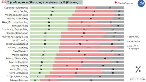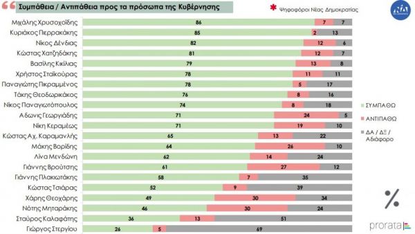 Στην ερώτηση σχετικά με τη συμπάθεια προς τα πολιτικά πρόσωπα, στη Κυβέρνηση της Νέας Δημοκρατίας πρώτος έρχεται στο σύνολο του δείγματος ο Κυριάκος Πιερρακάκης με 49% ενώ στους ψηφοφόφους του κόμματος πρώτος έρχεται ο Μιχάλης Χρυσοχοϊδης με 86%.