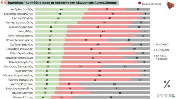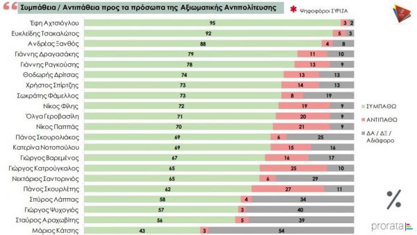 Στον ΣΥΡΙΖΑ πρώτος έρχεται ο Ανδρέας Ξανθός με 46% στο σύνολο του δείγματος ενώ στους ψηφοφόρους του κόμματος πρώτη είναι η Έφη Αχτσιόγλου με 95% ποσοστό συμπάθειας.