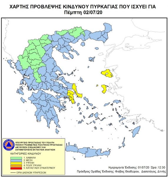 Yψηλός κίνδυνος πυρκαγιάς (κατηγορία κινδύνου 3) προβλέπεται την Πέμπτη 2/7, σύμφωνα με το Χάρτη Πρόβλεψης Κινδύνου Πυρκαγιάς που εκδίδει η Γενική Γραμματεία Πολιτικής Προστασίας.