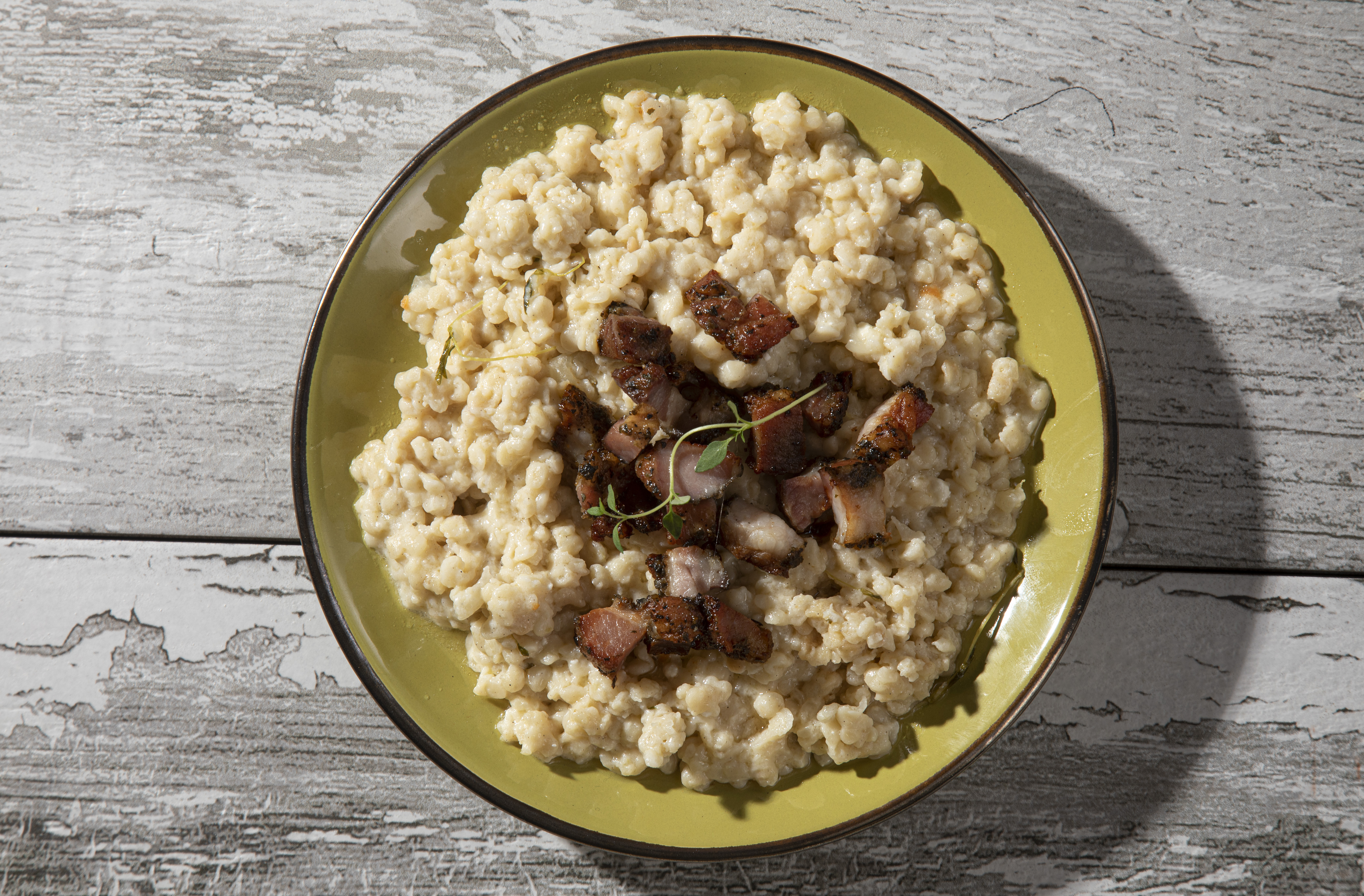 Στη συνέχεια αποσύρουμε από τη φωτιά και δένουμε το τραχανότο με βούτυρο, γραβιέρα, πηκτόγαλο Χανίων, χυμό και ξύσμα λεμονιού.