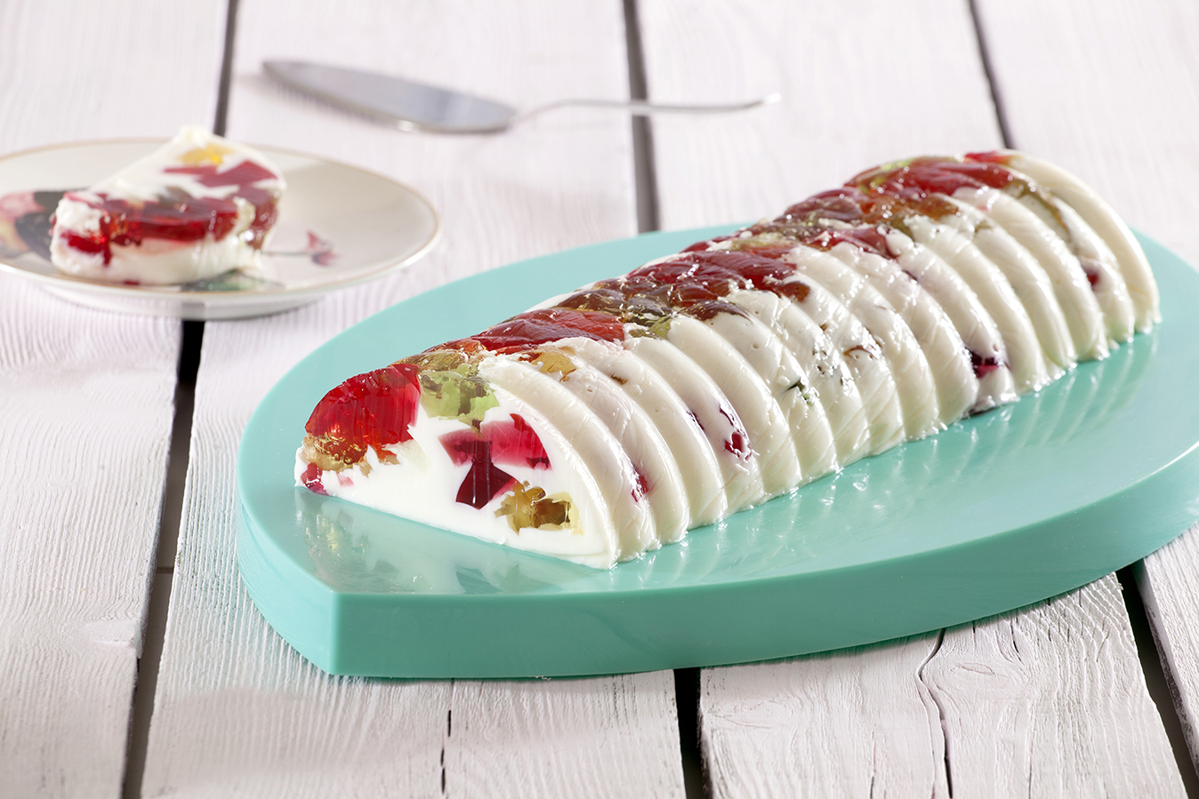 Βγάζουμε τα ζελέ από το ψυγείο και τα κόβουμε σε μικρούς κύβους. Τα αδειάζουμε σε μια φόρμα για κέικ σχήματος της αρεσκείας μας και από πάνω ρίχνουμε το ζαχαρούχο γάλα που έχει κρυώσει. Βάζουμε το γλυκό στο ψυγείο για τουλάχιστον 4 ώρες, να πήξει πολύ καλά.