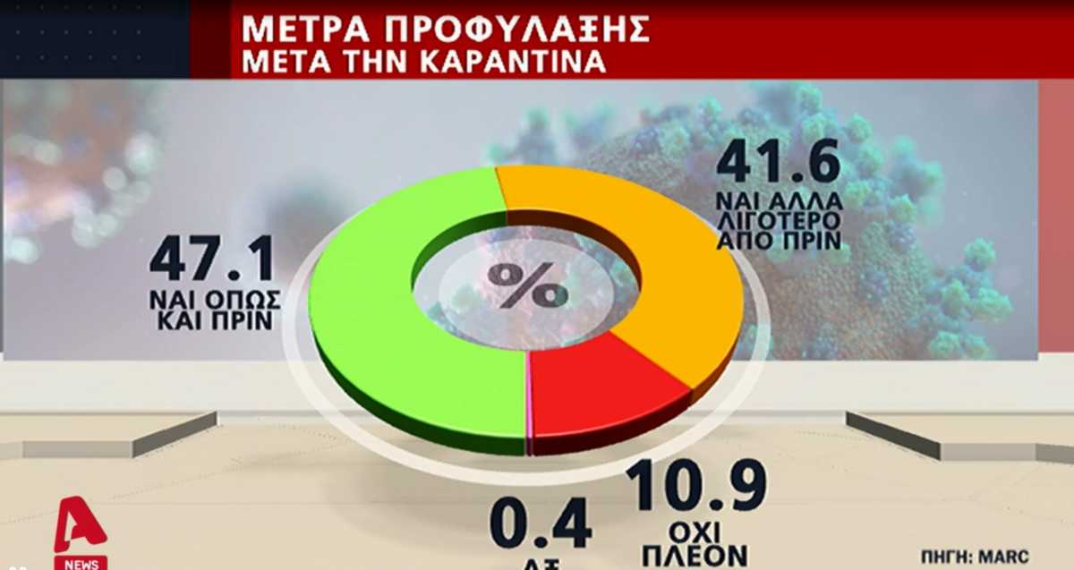 Το 47,1% απαντά πως τηρεί μέτρα προφύλαξης για τον κοροναϊό, όπως κατά τη διάρκεια της καραντίνας, ενώ το 41,6% απαντά πως ναι μεν παίρνει μέτρα αλλά όχι όπως πριν. Το 10,9% απαντά πως πλέον δεν παίρνει μέτρα προφύλαξης.