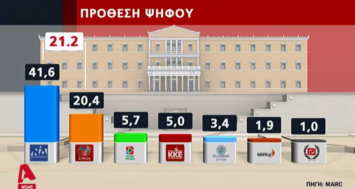 Συγκεκριμένα, στην πρόθεση ψήφου η Νέα Δημοκρατία συγκεντρώνει 41,6% έναντι 20,4% του ΣΥΡΙΖΑ. Το ΚΙΝΑΛ ακολουθεί με 5,7%, το ΚΚΕ λαμβάνει 5%, η Ελληνική Λύση 3,4%, το ΜέΡΑ26 1,9% και η Χρυσή Αυγή 1%. Στο 14% οι αναποφάσιστοι.