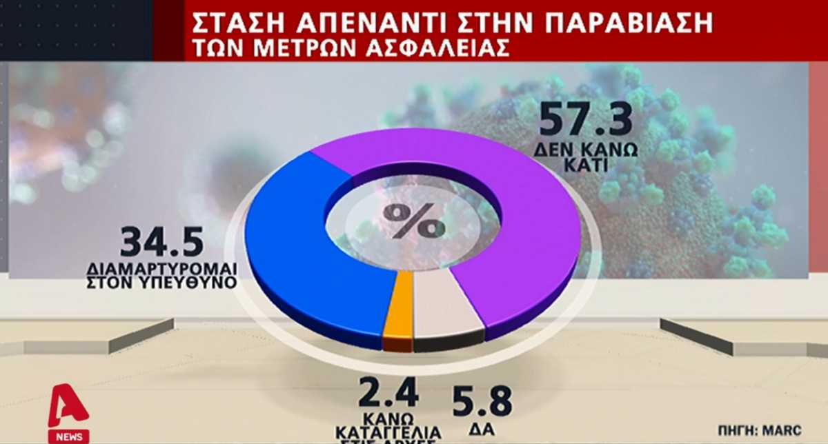 Ακόμα, σύμφωνα με τη δημοσκόπηση της εταιρείας MARC για τον τηλεοπτικό σταθμό Alpha, θετικό πρόσημο παίρνει η κυβέρνηση και στους χειρισμούς της αναφορικά με την αντιμετώπιση της πανδημίας.
