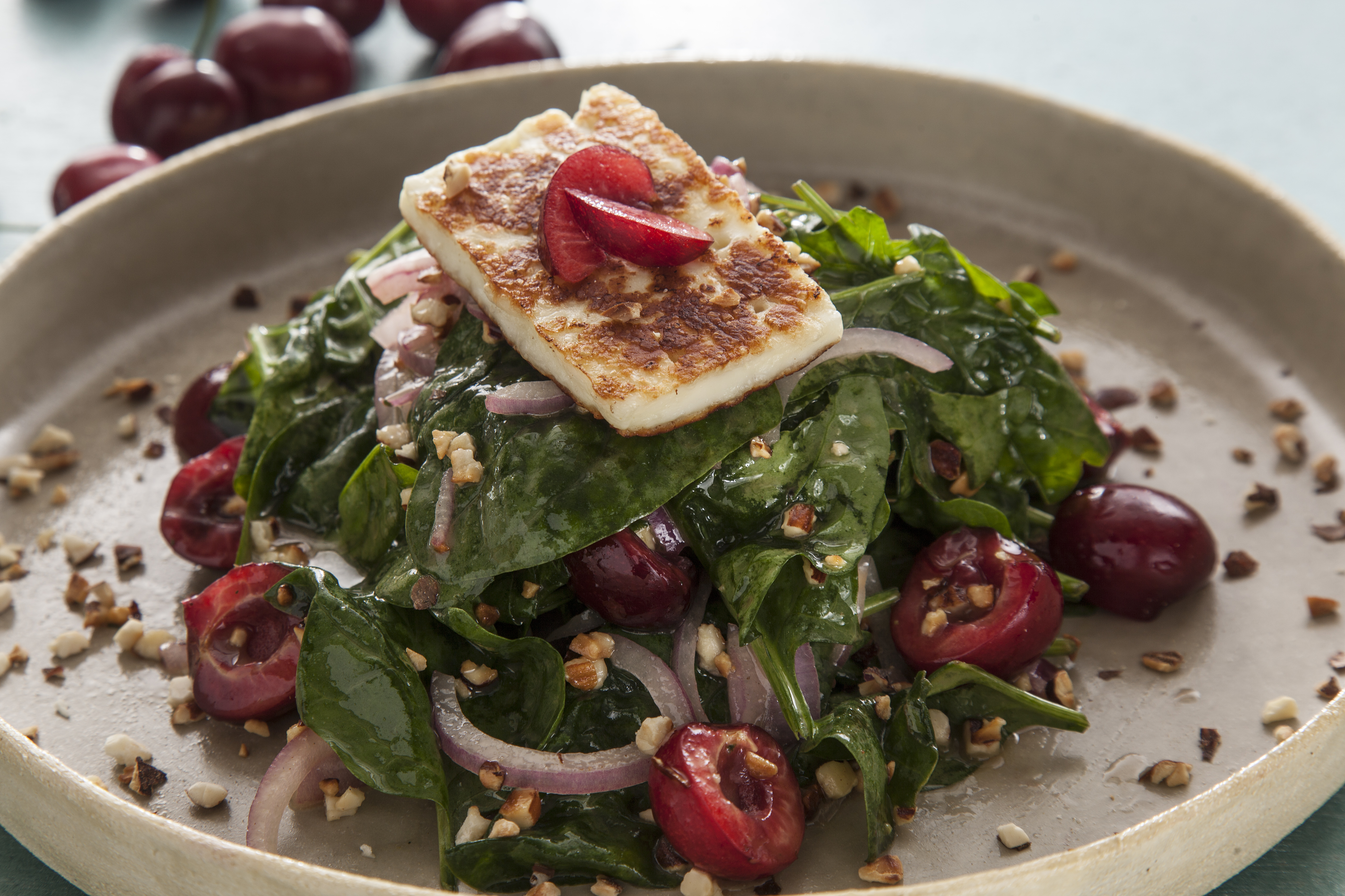 Αφαιρούμε το κουκούτσι από τα κεράσια και τα κόβουμε στη μέση. Βάζουμε το σπανάκι σε ένα μπολ με τα μισά κεράσια, τα μισά αμύγδαλα και το κρεμμύδι. Προσθέτουμε το ντρέσινγκ κατά βούληση και ανακατεύουμε (δεν χρειάζεται να το βάλουμε όλο, μπορεί να διατηρηθεί στο ψυγείο για αρκετές ημέρες).