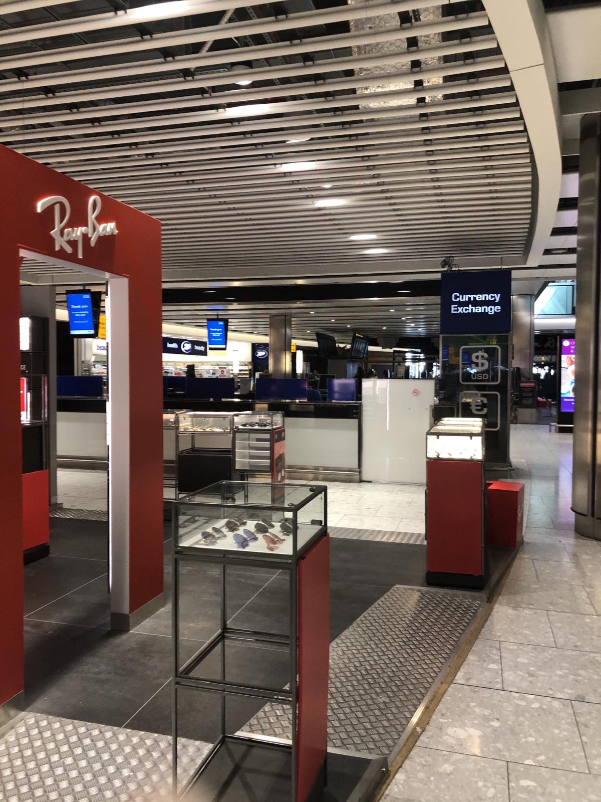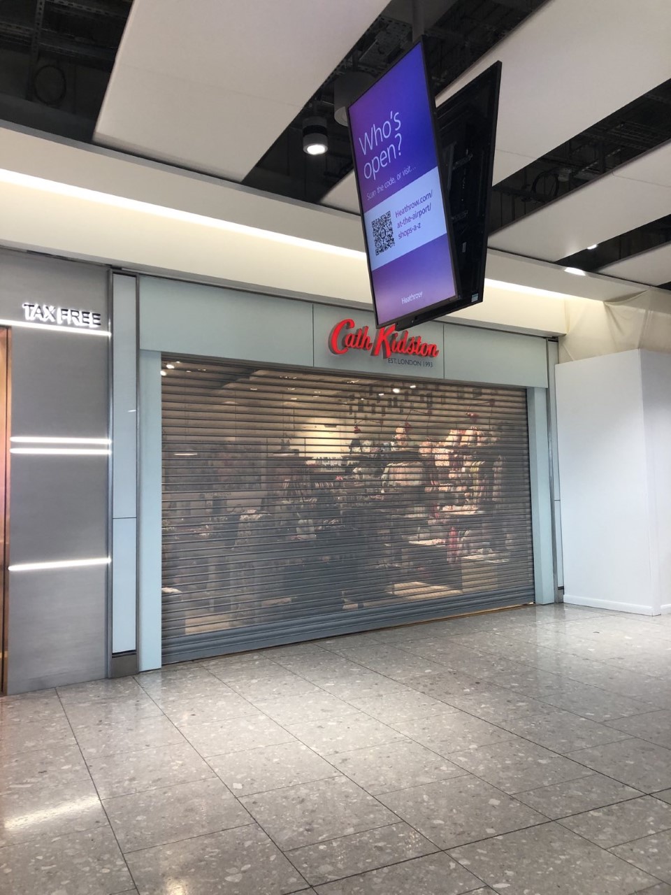 Προχωρώντας κανείς από τον έλεγχο των εισιτηρίων στους χώρους πριν την επιβίβαση στα αεροσκάφη, βλέπει τα άλλοτε πολυσύχναστα καταστήματα – από όπου θα έκανε τα τελευταία του ψώνια, ένα μικρό δωράκι για κάποιο φιλικό πρόσωπο, τις αγαπημένες του σοκολάτες ή το άρωμά του – κλειστά.