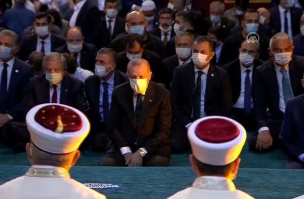 Ο τούρκος πρόεδρος συνοδευόμενος από άνδρες της προσωπικής του φρουράς, έφτασε στην Αγία Σοφία λίγο μετά τις 12 το μεσημέρι φορώντας μάσκα. Ο Ερντογάν πήρε τη θέση του στην πρώτη σειρά και γονάτισε στα ειδικά χαλιά που είχαν τοποθετηθεί για την προσευχή.