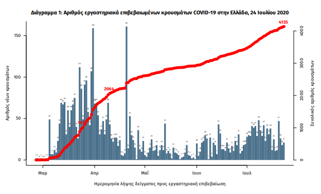 Έτσι, ο συνολικός αριθμός των κρουσμάτων είναι 4.135, εκ των οποίων το 54.6% αφορά άνδρες, ενώ 1.155 (27.9%) θεωρούνται σχετιζόμενα με ταξίδι από το εξωτερικό και 2.086 (50.4%) είναι σχετιζόμενα με ήδη γνωστό κρούσμα.
