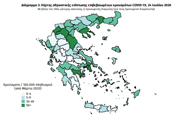 Ο χάρτης αποτυπώνει τη γεωγραφική κατανομή των συνολικών κρουσμάτων COVID-19 (από την αρχή της επιδημίας) ανά Περιφερειακή Ενότητα της χώρας, με βάση την δηλωθείσα διεύθυνση μόνιμης κατοικίας του ασθενούς, ή τη διεύθυνση προσωρινής διαμονής για τους τουρίστες και άλλους προσωρινά διαμένοντες στην Ελλάδα. Συμπεριλαμβάνονται τόσο κρούσματα με ιστορικό ταξιδιού (“εισαγόμενα”) όσο και κρούσματα με πιθανή εγχώρια μετάδοση.