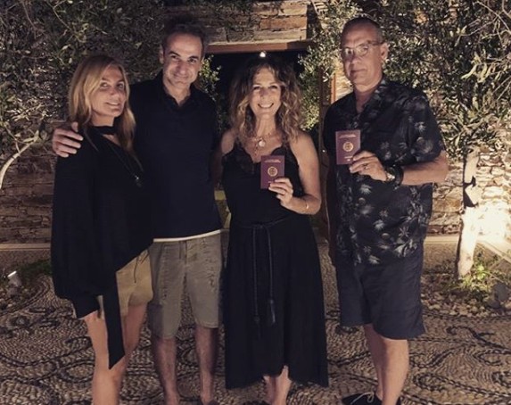 Με τα ελληνικά τους διαβατήρια ανά χείρας φωτογραφήθηκαν ο ηθοποιός Τομ Χανκς και η σύζυγός του Ρίτα Γουίλσον μαζί με τον πρωθυπουργό Κυριάκο Μητσοτάκη και τη σύζυγό του Μαρέβα στην Πάρο.
