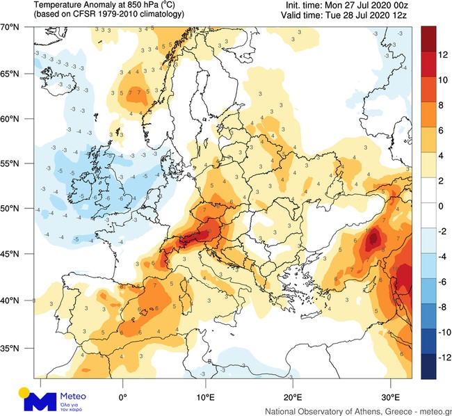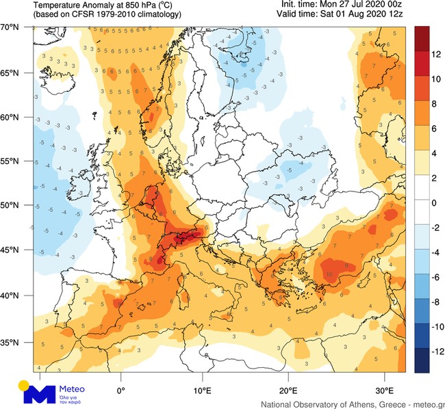 Στους προγνωστικούς χάρτες που ακολουθούν παρουσιάζονται οι αέριες μάζες σε ύψος περίπου 1500 μέτρων την Τρίτη 28/07 και το Σάββατο 01/08 και πιο συγκεκριμένα η απόκλιση των θερμοκρασιών τους από τις κανονικές για την εποχή τιμές τους. Με πορτοκαλί και κόκκινες αποχρώσεις χρωματίζονται οι θερμές αέριες μάζες. Επισημαίνεται ότι οι θερμοκρασίες των αερίων μαζών που τη Δευτέρα 27/07 κυμαίνονται σχεδόν στα κανονικά για την εποχή επίπεδα, θα βρεθούν 2 με 3 βαθμούς πάνω από αυτά την Τρίτη 28/07 και 6 με 7 βαθμούς πάνω από αυτά το Σάββατο 01/08.