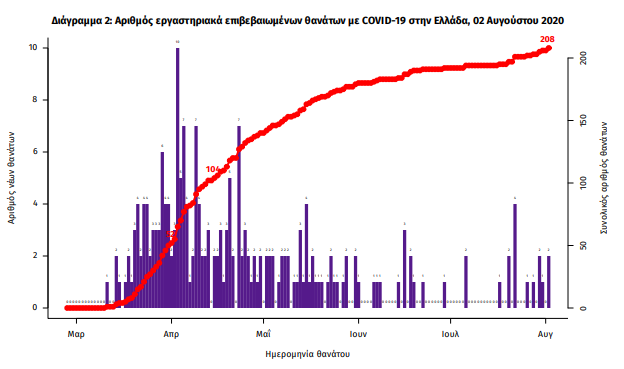 Τέλος, έχουμε δύο ακόμα καταγεγραμμένους θανάτους και 208 θανάτους συνολικά στη χώρα. Οι 67 (32.2%) ήταν γυναίκες και οι υπόλοιποι άνδρες. Η διάμεση ηλικία των θανόντων συμπολιτών μας ήταν τα NA έτη και το 95.7% είχε κάποιο υποκείμενο νόσημα ή/και ηλικία 70 ετών και άνω.