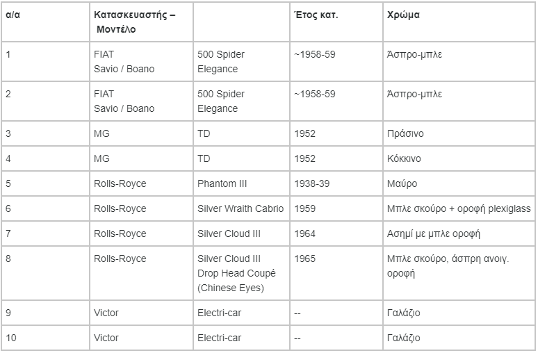 Ολοκληρώθηκε από τη Διεύθυνση Συντήρησης Αρχαίων και Νεωτέρων Μνημείων του Υπουργείου Πολιτισμού και Αθλητισμού η μεταφορά των οχημάτων της τ. Βασιλικής Οικογένειας, ως συνέχεια της Μελέτης-Πλαίσιο για την Προστασία και Συντήρησή τους, η οποία εγκρίθηκε πρόσφατα από το Κεντρικό Συμβούλιο Νεωτέρων Μνημείων.