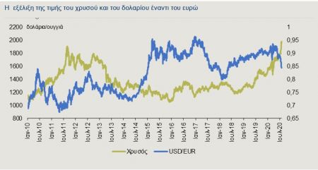 Η τιμή του χρυσού, στις 3 Αυγούστου, έφτασε στο υψηλότερο επίπεδο όλων των εποχών, ήτοι 1.991 δολάρια ΗΠΑ ανά ουγγιά, έχοντας σημειώσει άνοδο για επτά συνεχόμενες εβδομάδες, δυναμική που έχει να εμφανιστεί από το 2011. Στο σημείο αυτό, αξίζει να επισημάνουμε ότι, διαχρονικά, η σχέση που συνδέει την αξία του δολαρίου με την τιμή του χρυσού είναι αρνητική.