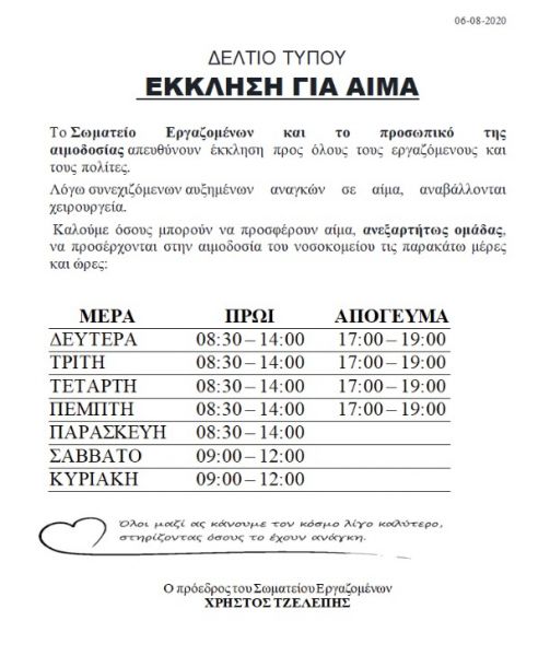«Λόγω συνεχιζόμενων αυξημένων αναγκών σε αίμα αναβάλλονται χειρουργεία» αναφέρουν στην ανακοίνωσή τους και καλούν «όσους μπορούν να προσφέρουν αίμα, ανεξαρτήτως ομάδας, να προσέρχονται στην αιμοδοσία του νοσοκομείου τις παρακάτω μέρες και ώρες»