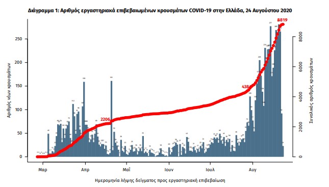 Ο συνολικός αριθμός των κρουσμάτων είναι 8819, εκ των οποίων το 55.3% άνδρες, ενώ 1.886 (21.4%) θεωρούνται σχετιζόμενα με ταξίδι από το εξωτερικό και 4.009 (45.5%) είναι σχετιζόμενα με ήδη γνωστό κρούσμα.