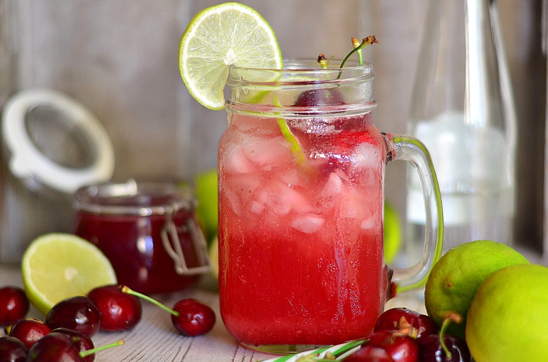 Για να φτιάξουμε το αναψυκτικό βάζουμε πάγο, 30 γρ. από το μείγμα κερασιού και λεμόνι ή lime και συμπληρώνουμε με ανθρακούχο νερό, ανακατεύοντας καλά. Γαρνίρουμε με δυόσμο και κεράσια.