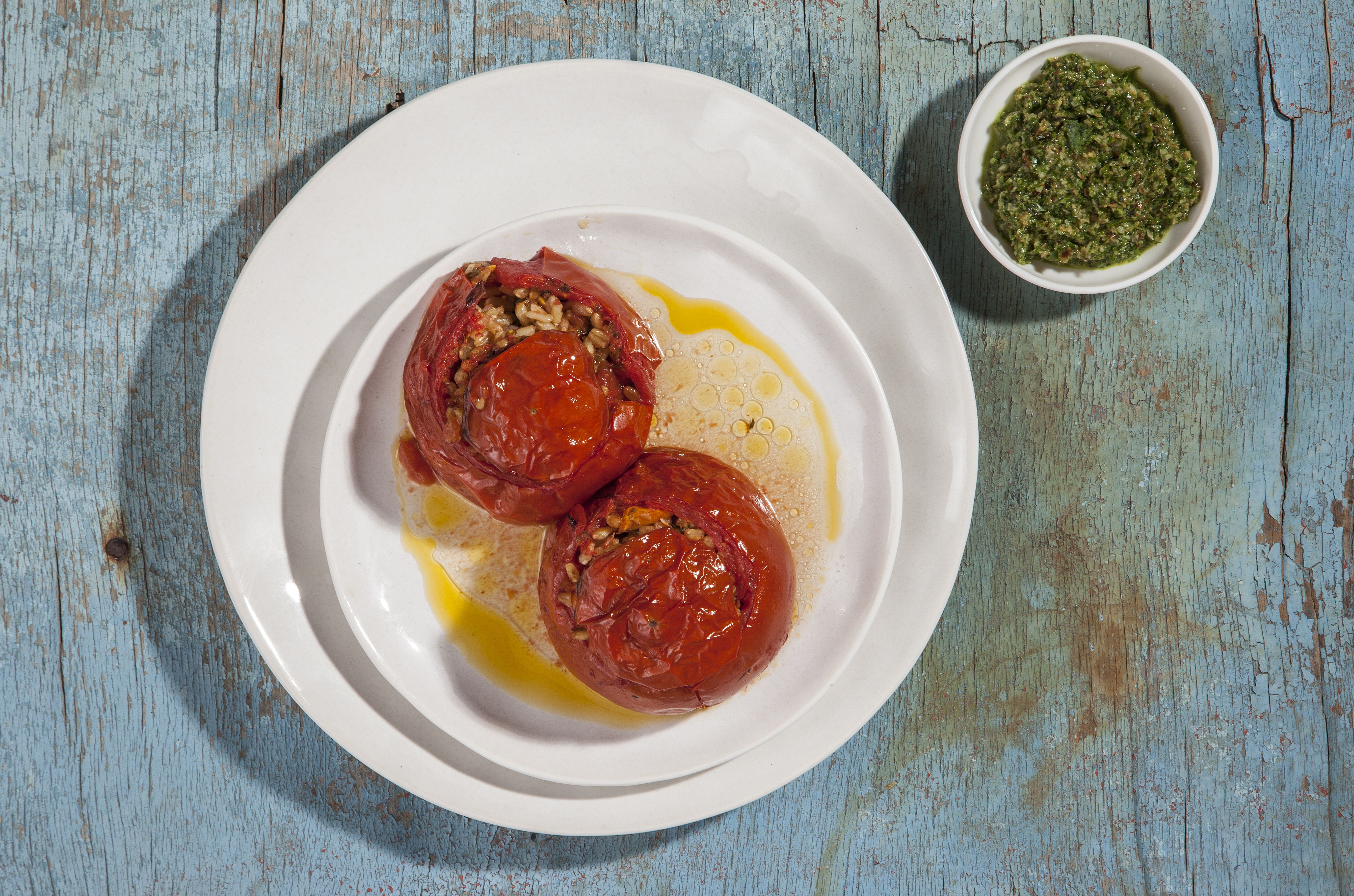 Προθερμαίνουμε τον φούρνο στους 180°C. Γεμίζουμε τις ντομάτες με το μείγμα του σιταριού και τις σκεπάζουμε με το καπάκι τους. Τις βάζουμε σε ένα ταψί και τις ραντίζουμε με ελαιόλαδο. Ρίχνουμε στο ταψί 2 – 3 σκελίδες σκόρδο με τη φλούδα τους, για να δώσουν άρωμα χωρίς να καούν, καθώς και τους μίσχους των μυρωδικών. Ρίχνουμε ελάχιστο νερό και ψήνουμε για 20-25 λεπτά μέχρι να ψηθεί η ντομάτα και να δέσουν τα αρώματα.