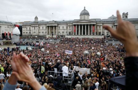 Η πλατεία Τραφάλγκαρ του Λονδίνου το περασμένο Σάββατο γέμισε με αντιεμβολιαστές και κάθε λογής συνωμοσιολόγους, αρνητές της πανδημίας που χωρίς φυσικά να φορούν μάσκα ή να τηρούν αποστάσεις ασφαλείας, έκαναν πορεία προς τη Ντάουνινγκ Στριτ και το βρετανικό Κοινοβούλιο, χαρακτηρίζοντας την πανδημία ως μια φάρσα και μια απάτη.