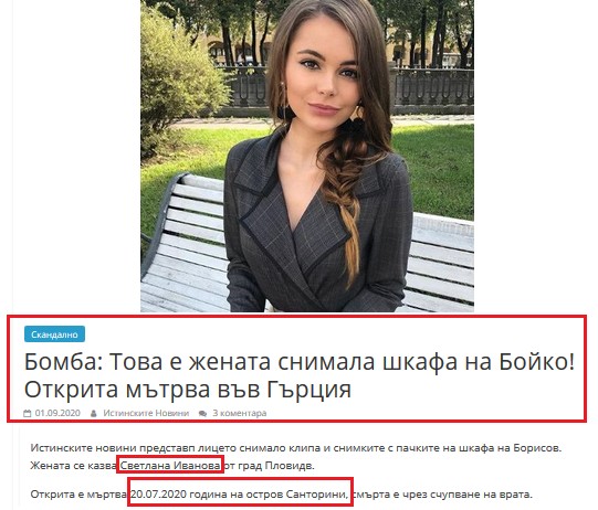 Η εν λόγω γυναίκα φερόταν, σύμφωνα με τα δημοσιεύματα βουλγαρικών ΜΜΕ, να ήταν αυτή που είχε τραβήξει τις σκανδαλώδεις φωτογραφίες του Πρωθυπουργού της Βουλγαρίας Μπόικο Μπορίσοφ στο δωμάτιό του, με ράβδους χρυσού, δέσμες χαρτονομισμάτων ευρώ και όπλο που είχαν δημοσιοποιηθεί στα μέσα του περασμένου Ιουνίου κι είχαν δημιουργήσει μεγάλη αναστάτωση.