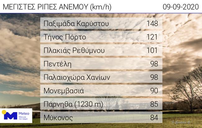 Οι ισχυρότερες ριπές ανέμου έως το μεσημέρι της Τετάρτης που κατέγραψαν οι σταθμοί του Εθνικού Αστεροσκοπείου Αθηνών/meteo.gr, ήταν στην Παξιμάδα Καρύστου (148 χιλιόμετρα την ώρα), στην Τήνο (121 χλμ./ώρα), στον Πλακιά Ρεθύμνου (101) και στην Πεντέλη (98).