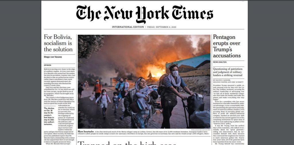 Πρωτοσέλιδο των New York Times έγινε η σοκαριστική φωτογραφία του καταξιωμένου Έλληνα φωτογράφου,Πέτρου Γιαννακούρη, όπου δείχνει τους πρόσφυγες στη Μόρια να τρέχουν να σωθούν από τη φωτιά που ξέσπασε στο ΚΥΤ.