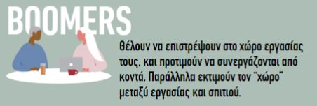 – Gen X – Boomers: Οι Gen X εκτιμούν ιδιαίτερα την παρουσία τους στον χώρο εργασίας για την καλύτερη συγκέντρωση τους και αποτελεσματική συνεργασία, μακριά από τις ευθύνες του νοικοκυριού. Οι Boomers (34%) επιλέγουν ως κύριους λόγους επιστροφής στον χώρο εργασίας την κοινωνικοποίηση και την συνεργασία
