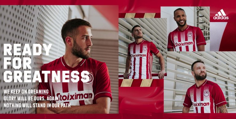 Λίγη ώρα μετά το promo-video η ερυθρόλευκη ΠΑΕ προχώρησε στα «αποκαλυπτήρια» της φανέλας για τη νέα σεζόν, η οποία έχει ιδιαιτερότητες σε σχέση με τα προηγούμενα χρόνια.Το σλόγκαν των ερυθρολεύκων είναι «Ready For Greatness» και η καμπάνια έχει ως πρωταγωνιστές τους Κώστα Φορτούνη, Γιώργο Μασούρα, Γιουσέφ Ελ Αραμπί και Ματιέ Βαλμπουενά.