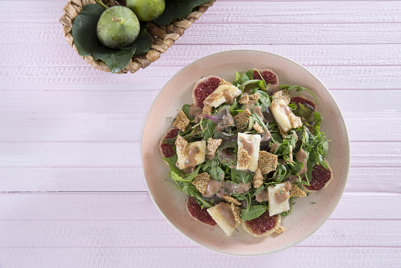 Ανακατεύουμε σε ένα μπολ τα φύλλα της σαλάτας με το θυμάρι και τα μισά παστέλια. Προσθέτουμε λίγη από τη σος και ανακατεύουμε. Βάζουμε τα κομμένα σύκα στη βάση μιας σαλατιέρας και αδειάζουμε από πάνω τη σαλάτα που είναι στο μπολ. Πασπαλίζουμε τα υπόλοιπα παστέλια, βάζουμε από πάνω τα κομμάτια του μπάτζου ή της φέτας και περιχύνουμε με τη σος.