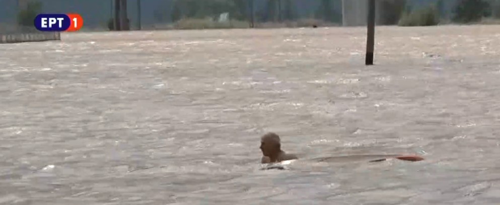 Ο άνδρας είχε εγκλωβιστεί στο σημείο λόγω των πλημμυρικών φαινομένων που έχουν πλήξει την ευρύτερη περιοχή από χθες και αναγκάστηκε να ανέβει πάνω στο καπό του οχήματός του για να μην τον παρασύρουν τα ορμητικά νερά.