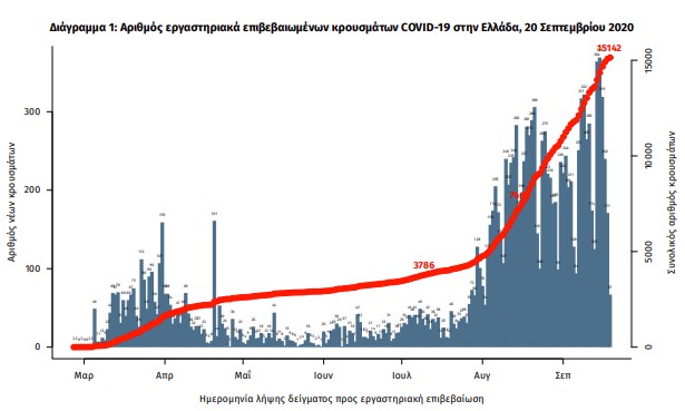 Έτσι, ο συνολικός αριθμός των κρουσμάτων είναι 15.142, εκ των οποίων το 55.7% άνδρες, ενώ 2.591 (17.1%) θεωρούνται σχετιζόμενα με ταξίδι από το εξωτερικό και 6.348 (41.9%) είναι σχετιζόμενα με ήδη γνωστό κρούσμα.