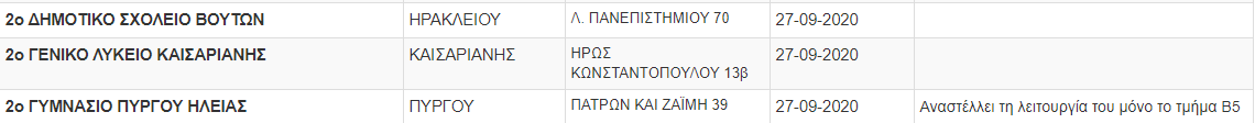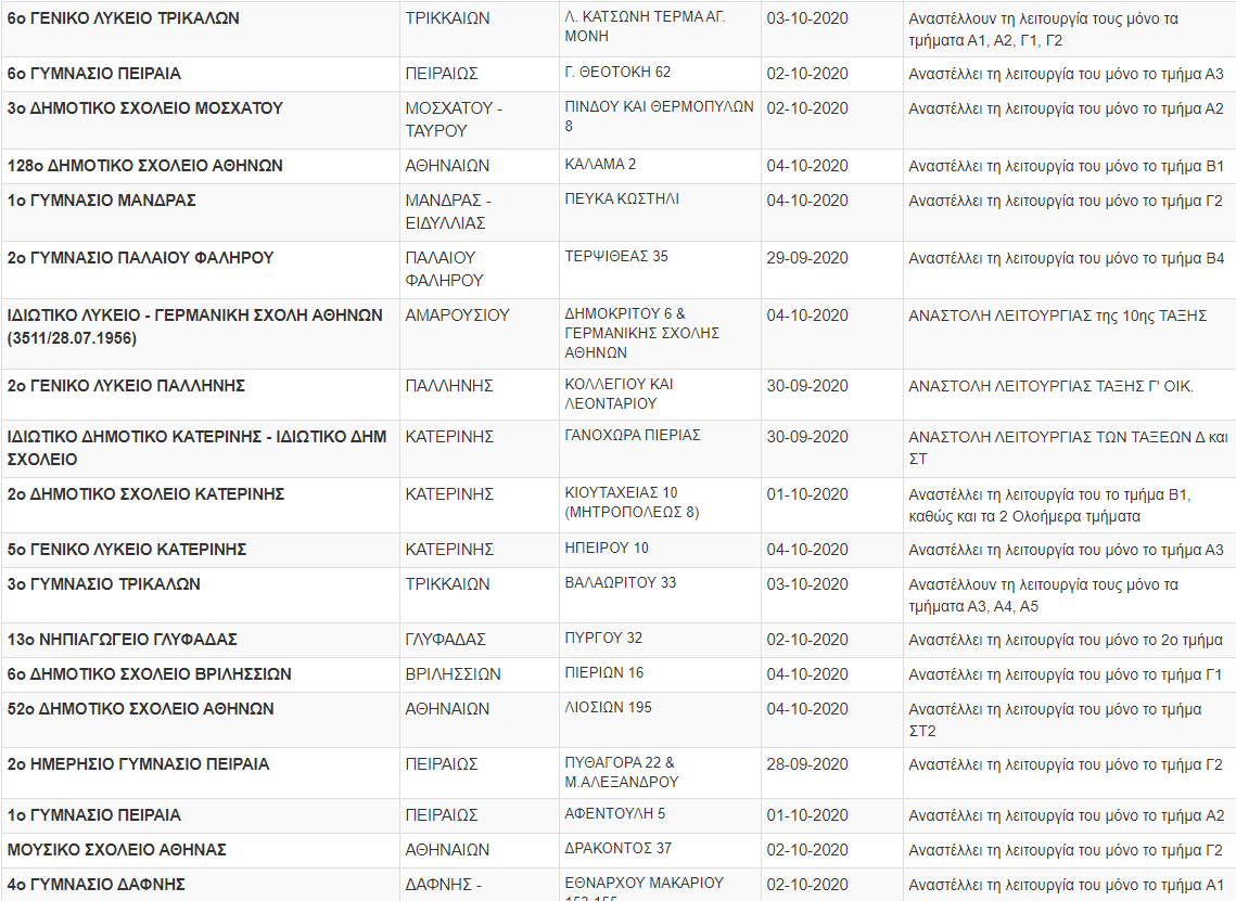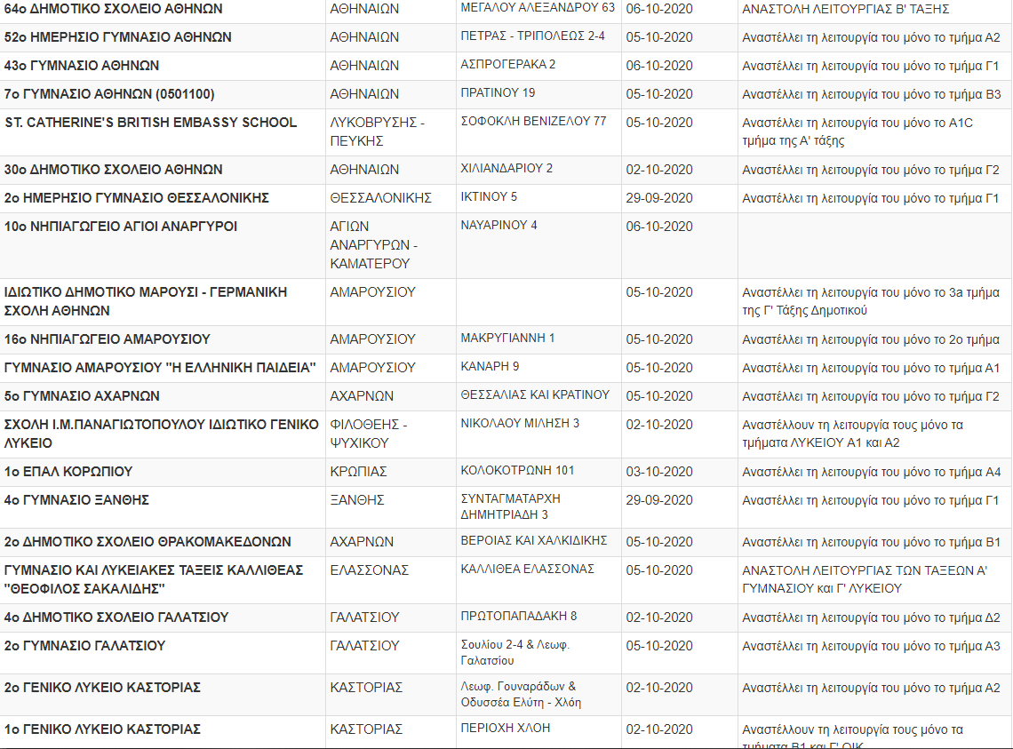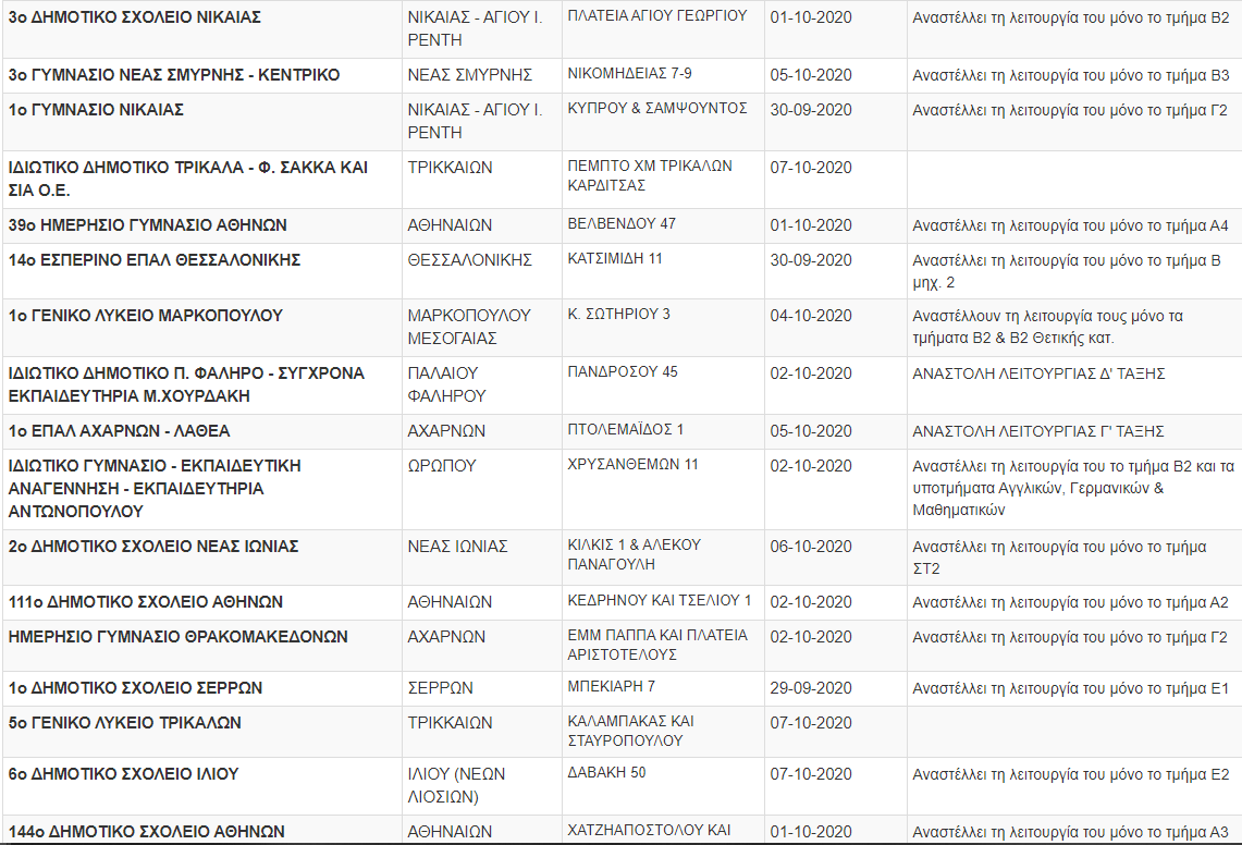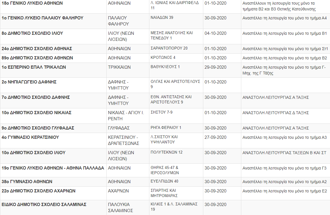 Μέχρι τις 30 Σεπτεμβρίου 2020 θα παραμείνει κλειστό το ειδικό δημοτικό σχολείο Σαλαμίνας, ενώ μέχρι την 1η Οκτωβρίου το 2ο νηπιαγωγείο Δάφνης. Κλειστά επίσης θα παραμείνουν έως 01-10-2020 το 14ο νηπιαγωγείο Καβάλας, έως 29-09-2020 το 7ο γυμνάσιο Νέας Σμύρνης και ως 02-10-2020 το 2ο γυμνάσιο Πετρούπολης.