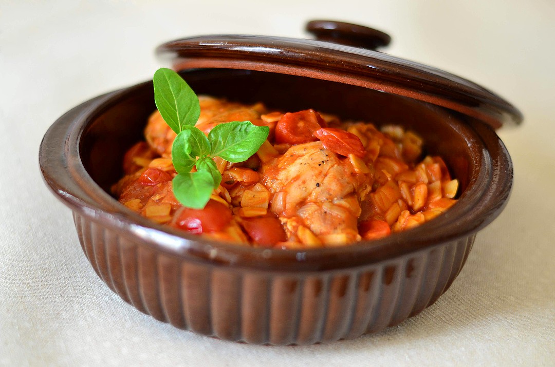 Σε αντικολλητικό τηγάνι με καπάκι ζεσταίνουμε 1 κ.σ. ελαιόλαδο. Μόλις κάψει, ρίχνουμε το θυμάρι και προσθέτουμε το κοτόπουλο. Ψήνουμε για 5-7 λεπτά από κάθε πλευρά ή μέχρι να πάρει καλό χρώμα. Κατεβάζουμε από τη φωτιά και στο ίδιο τηγάνι, χωρίς να το πλύνουμε, σοτάρουμε το κρεμμύδι με 1 κ.σ. ελαιόλαδο. Μόλις «γυαλίσει», προσθέτουμε τον πελτέ, τη ζάχαρη, τον βασιλικό, πιπέρι και αφήνουμε για άλλα 5 λεπτά. Προσθέτουμε τα ντοματίνια και σοτάρουμε για άλλα 5 λεπτά. Ρίχνουμε τον συμπυκνωμένο χυμό ντομάτας, τον ζωμό λαχανικών, το χυλοπιτάκι και το κοτόπουλο. Μόλις πάρουν μία βράση, σκεπάζουμε και αφήνουμε για 8-10 λεπτά (συμπληρώνουμε με λίγο ακόμα ζωμό αν χρειαστεί).
