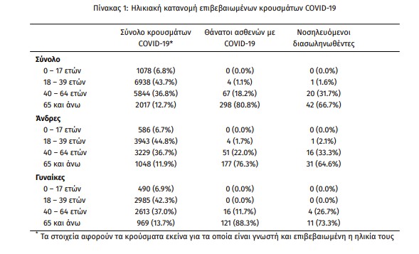 Η ηλικιακή κατανομή των (α) συνολικών κρουσμάτων, (β) των περιστατικών που κατέληξαν σε θάνατο και (γ) των ασθενών που νοσηλεύονται διασωληνωμένοι, είναι η ακόλουθη: